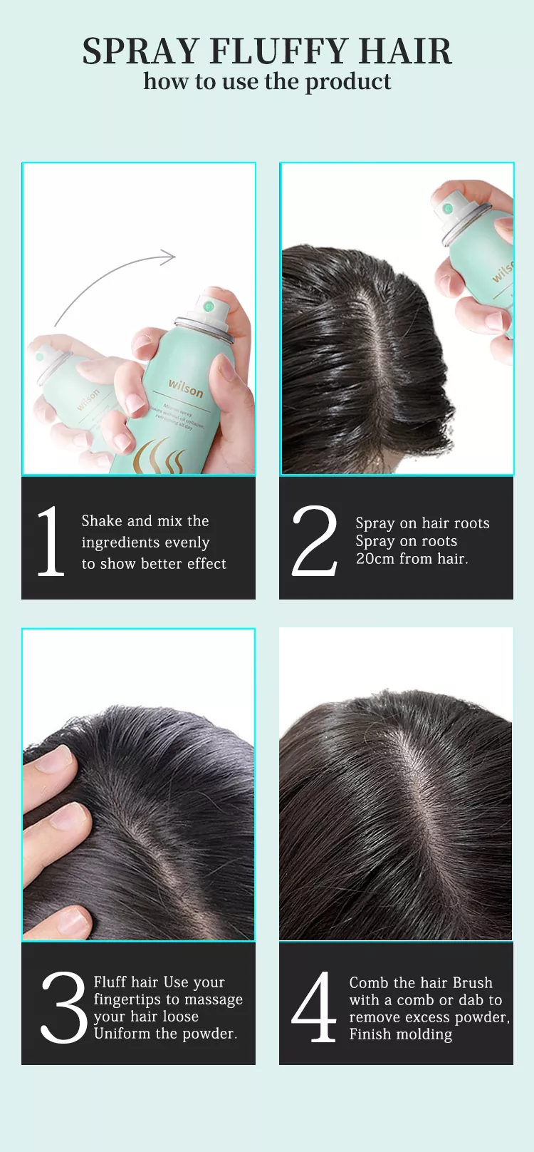 Wilson Instant չլվացվող սառը չոր շամպուն լակի ավելացնելով գլիցերին, տրիգլիցերիդ, վիտամին E, վիտամին B5 և մազերի խնամքի այլ բաղադրիչներ, որպեսզի մազերի սնուցումն ու խոնավությունը լրացնեն թեփը և մազերի պակասը, միևնույն ժամանակ լրացնեն մազերի յուղային շերտը, վերականգնեն մազերի վնասվածությունը, պաշտպանեն գլուխը արտաքին միջավայրից և վերջապես հասնեն առողջ մազերը վերականգնելու նպատակին: